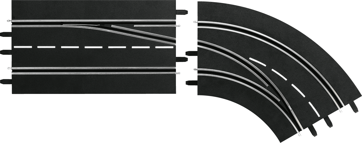 Surprise your opponents with daring overtaking manoeuvres. This lane change curve consists of two track sections and offers an overtaking option from the outer to the inner lane. Also suitable for the digitally retrofitted Carrera EVOLUTION track.