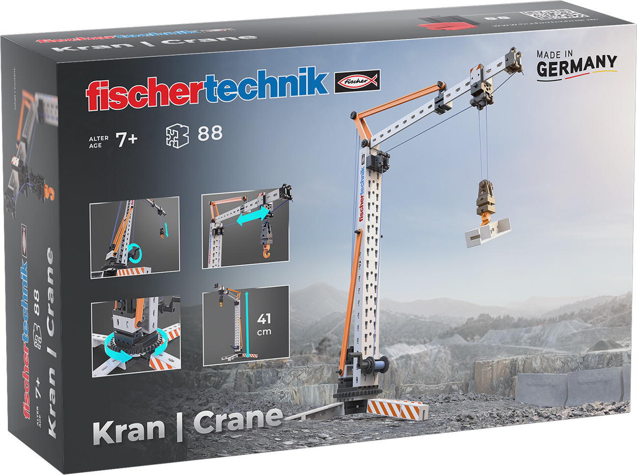 The fischertechnik crane brings a real construction site feeling into the children's room. Children can assemble the crane independently and then realise exciting construction projects. With rotating elements and a realistic boom, various objects can be lifted, rotated and moved - just like real construction site work. The robust construction and the new, modern colour look make the crane a highlight for all young builders.