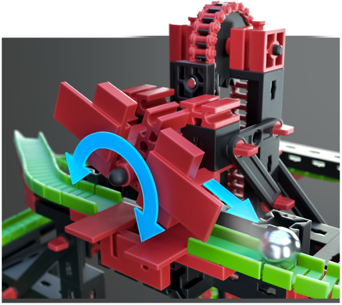 With PROFI Dynamic L2, things truly get going! The balls race through high-speed flex tracks, loops, roundabout funnels and mechanical switches. Children experience action-packed moments on seesaws and bends and can create their own courses. At the same time, they playfully learn the basics of physics such as acceleration, mass inertia and conservation of energy. The included XS motor transports the balls upwards again and again - so the fun is endless.
