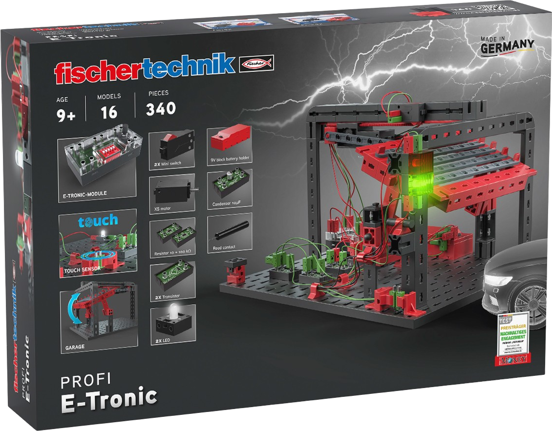 With the PROFI E-Tronic, children discover the world of electronics in a playful way. From simple electric circuits to series and parallel circuits to complex electronic models such as interchangeable indicators, garage doors or marble runs - the construction kit teaches basic understanding step by step. The electronics module with 16 programs, analogue inputs and motor outputs enables a wide range of experiments and creative constructions. An ideal construction kit for learning technical knowledge in a practical and interactive way.