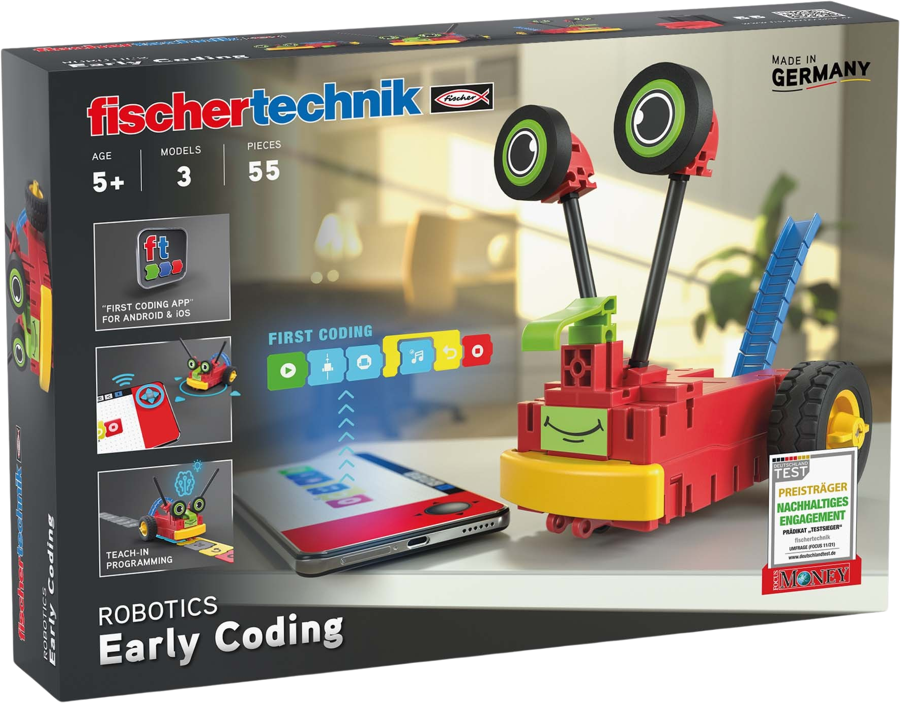 With the ROBOTICS Early Coding construction set, children can playfully discover the world of computer science and robotics. Simply switch on, connect via Bluetooth and start programming. The ready-made components and age-appropriate examples make it easy to get started with programming and bring their first robots to life. An exciting set for young inventors who want to combine technology and fun.