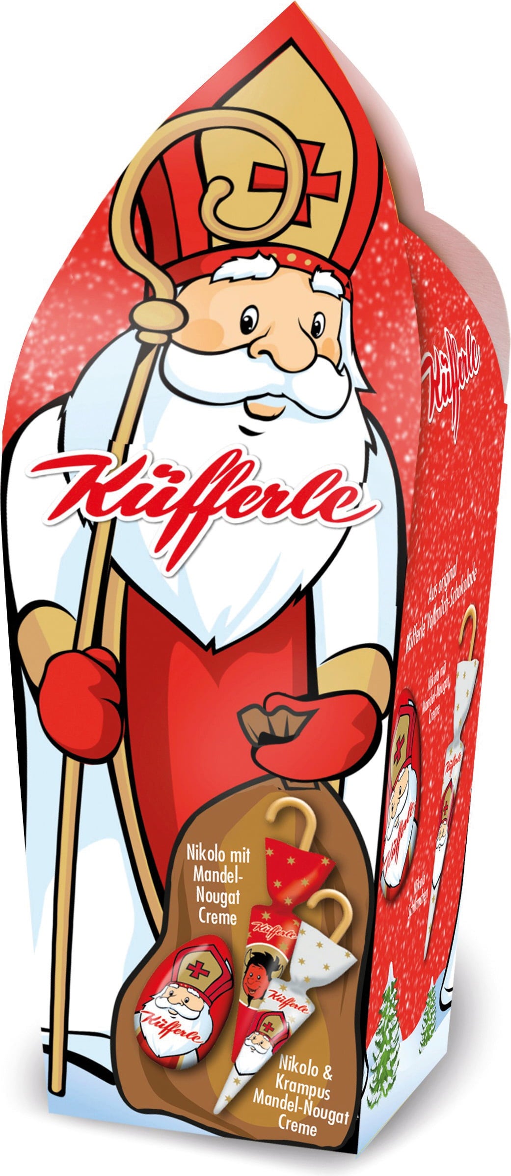 Sweeten the Advent season with Küfferle's Nokolo Gift pack filled with the popular milk chocolate umbrellas and exquisite St Nicholas chocolate with delicious almond nougat cream. This sweet gift is guaranteed to bring joy - whether as a stocking stuffer, table decor or a sweet treat between meals. A classic that makes the Christmas season extra special.