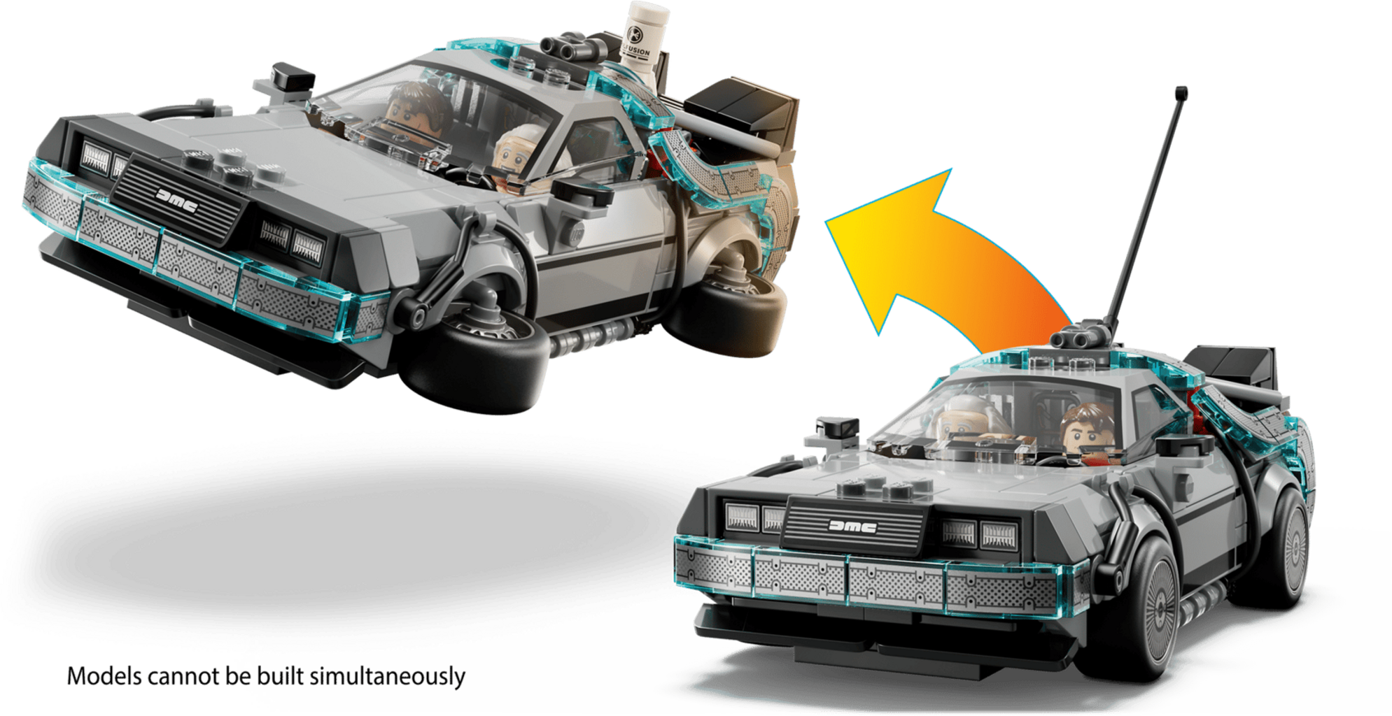 2 play options: The car toy has a lightning hook from the first movie, or it can be rebuilt into flying mode with sideways wheels and Mr. Fusion from the second movie.