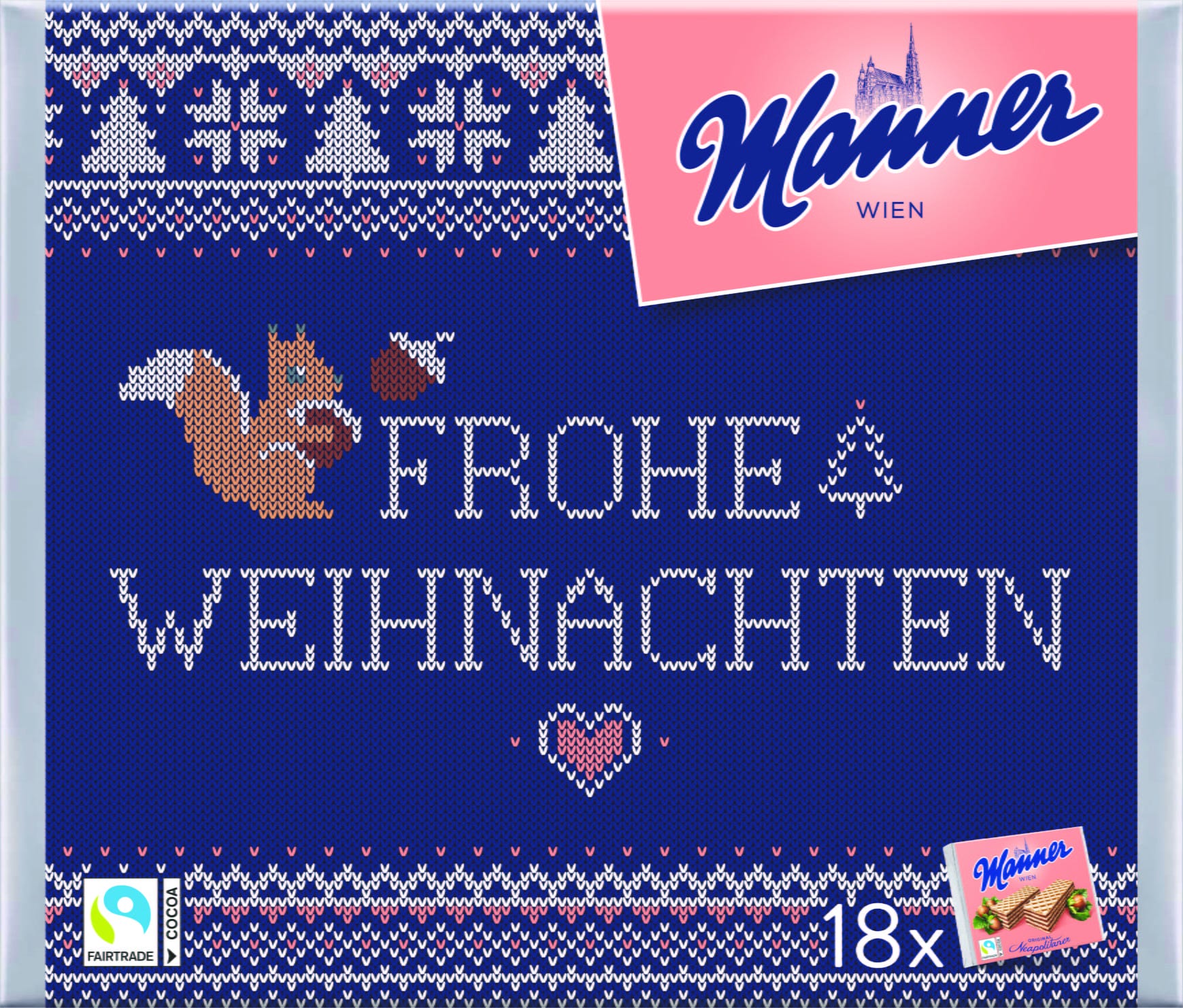 Manner Neapolitan wafers are classic Austrian sweets that are eagerly enjoyed by people of all ages. Crispy waffles and fine hazelnut cream make these treats irresistible. This great Christmas Edition delights with its festive design and 18 packs of delicious Neapolitan wafers.