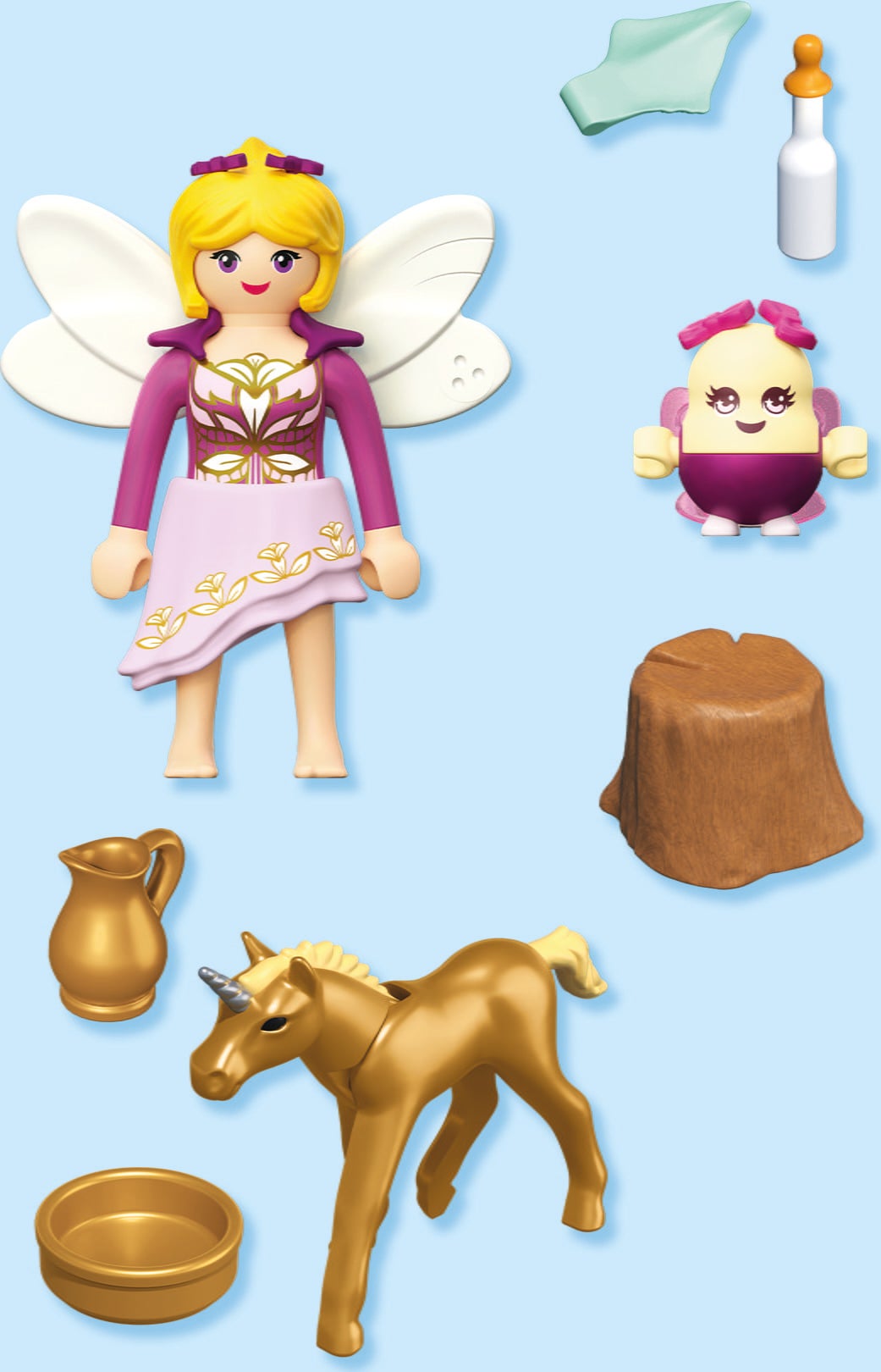 Content: 1 woman, 1 joyling, 1 unicorn foal, 1 tree stump, 1 bowl, 1 carafe, 1 cloth, 1 milk bottle, 2 wings, 1 skirt, 2 hair bows, 1 plait, 1 wing collar, 1 hair bow, 1 small pair of wings