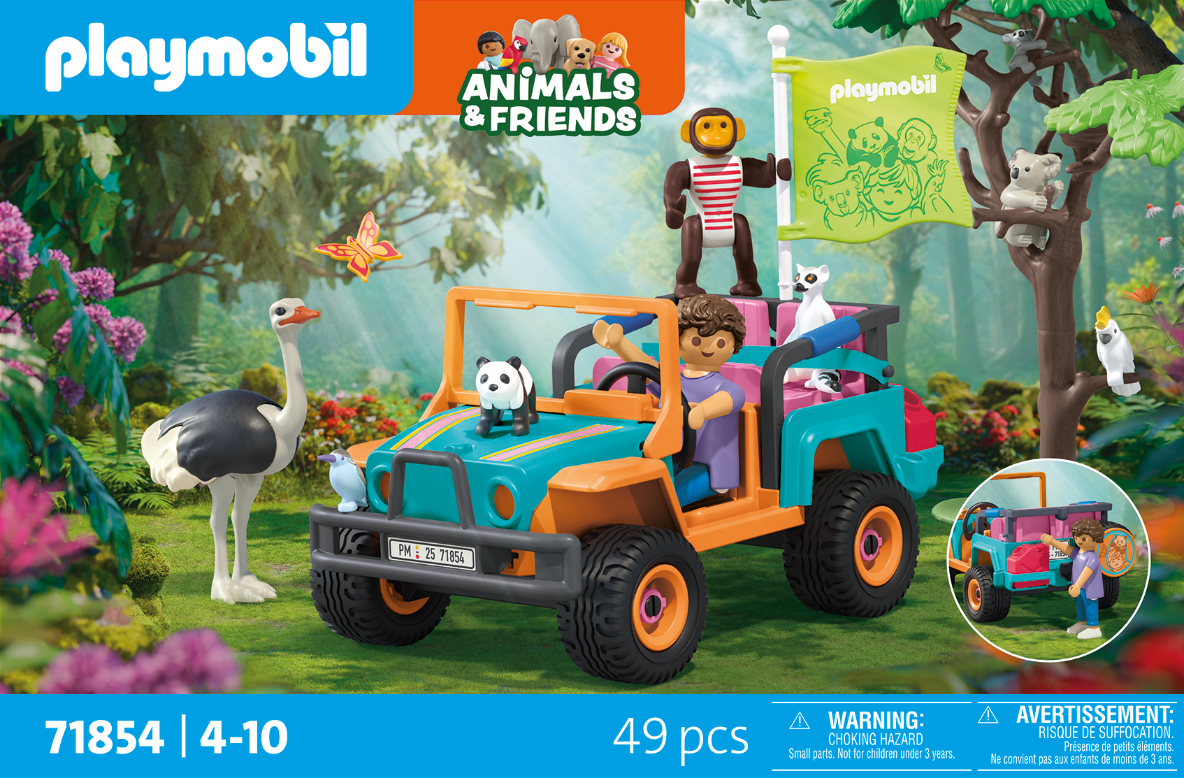 Figures: 1 off-road vehicle with flag, 1 tree with base plate, 1 bird's nest, 1 petrol canister, 1 safety belt, 1 figure, 1 ostrich, 1 monkey, 1 panda cub, 1 lemur, 1 mother koala with cub, 1 bird, 1 butterfly