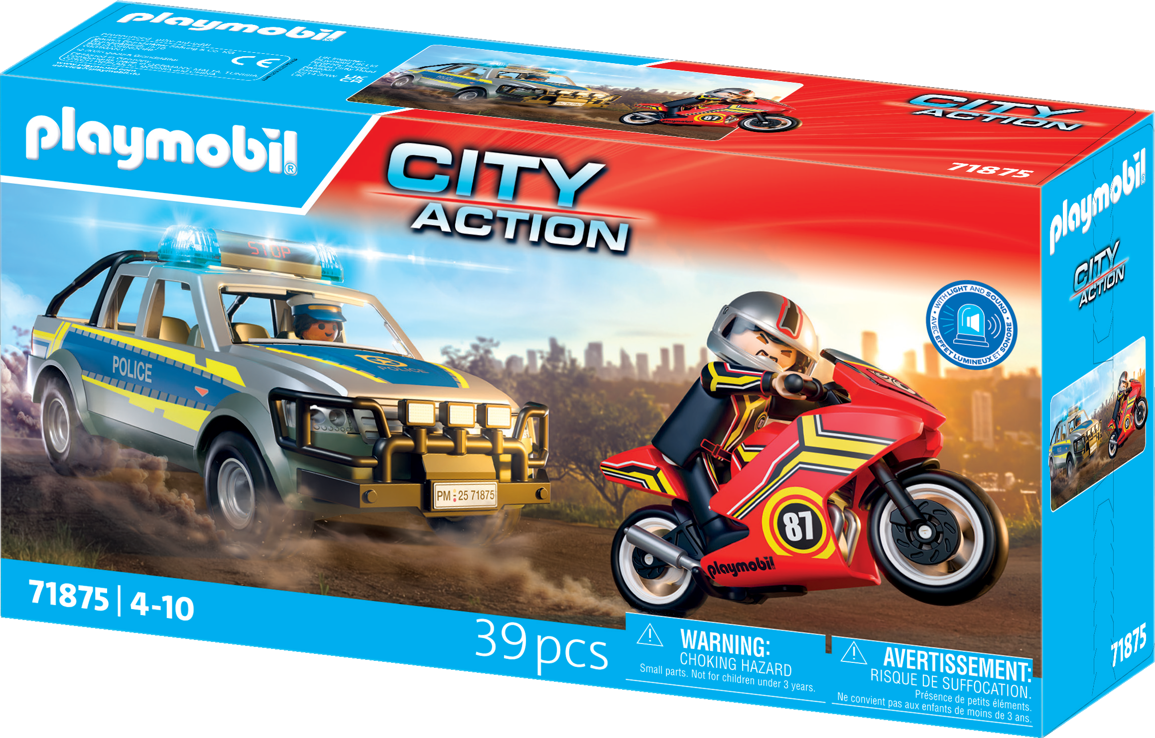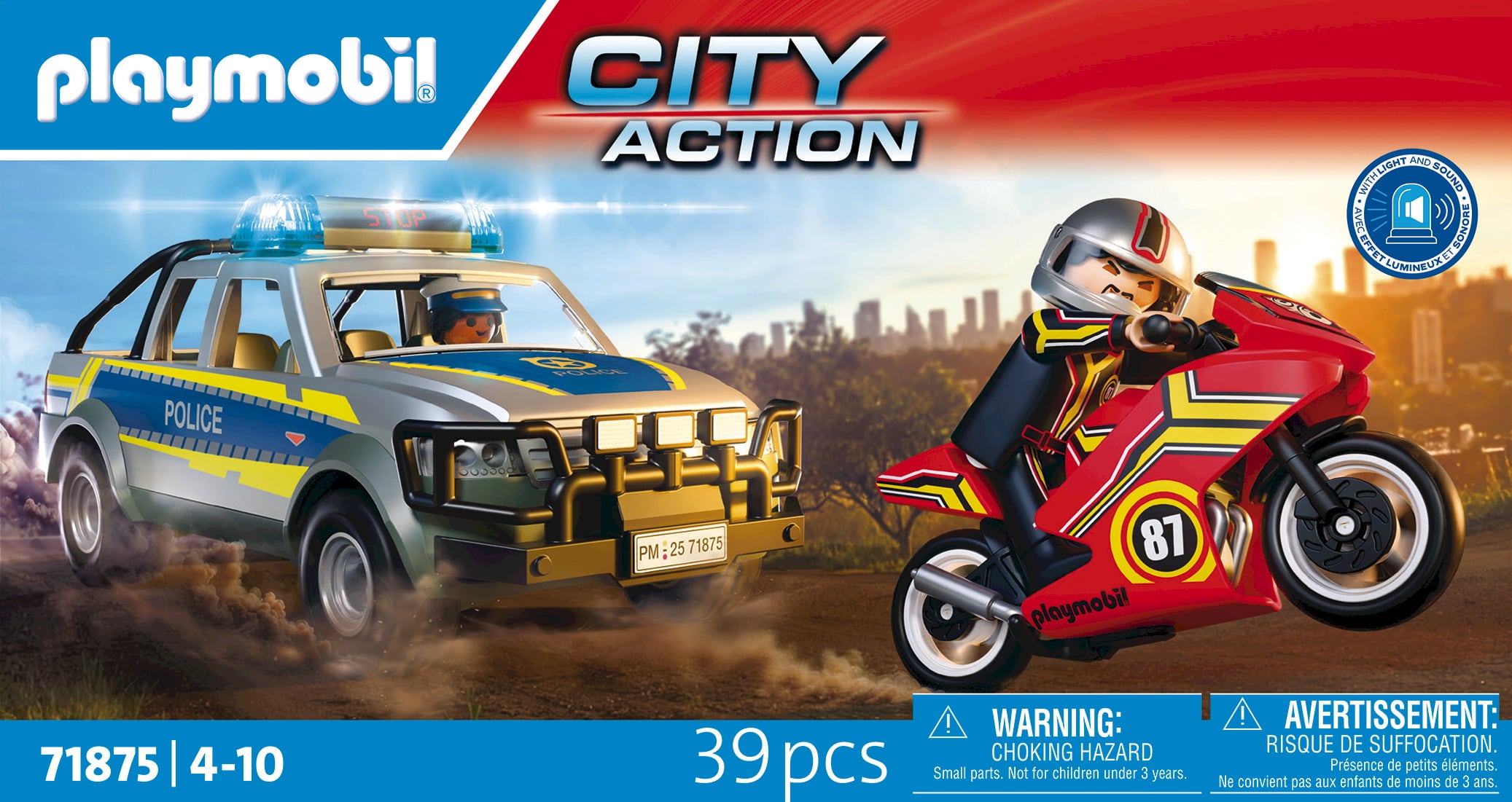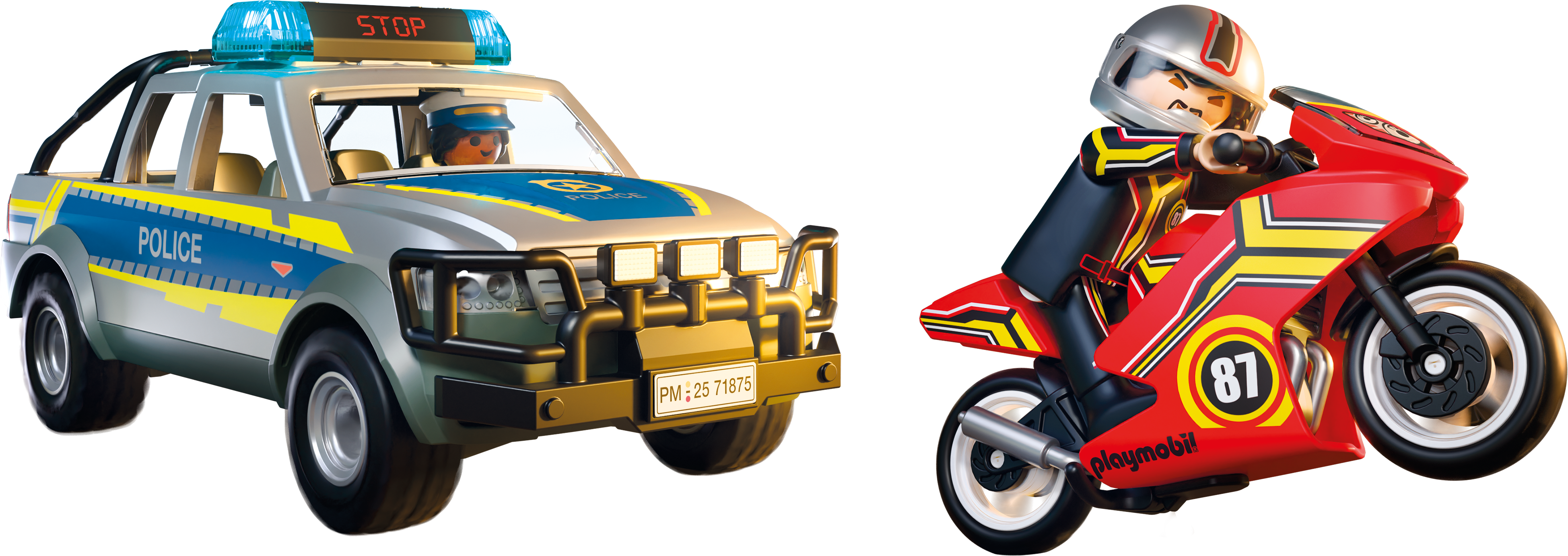 Contents: 2 figures, 1 police pick-up truck with cowcatcher & loading area, 1 motorbike, 1 police light & sound module, 1 high-visibility waistcoat, 1 pistol, 1 motorbike helmet, 1 nail strip