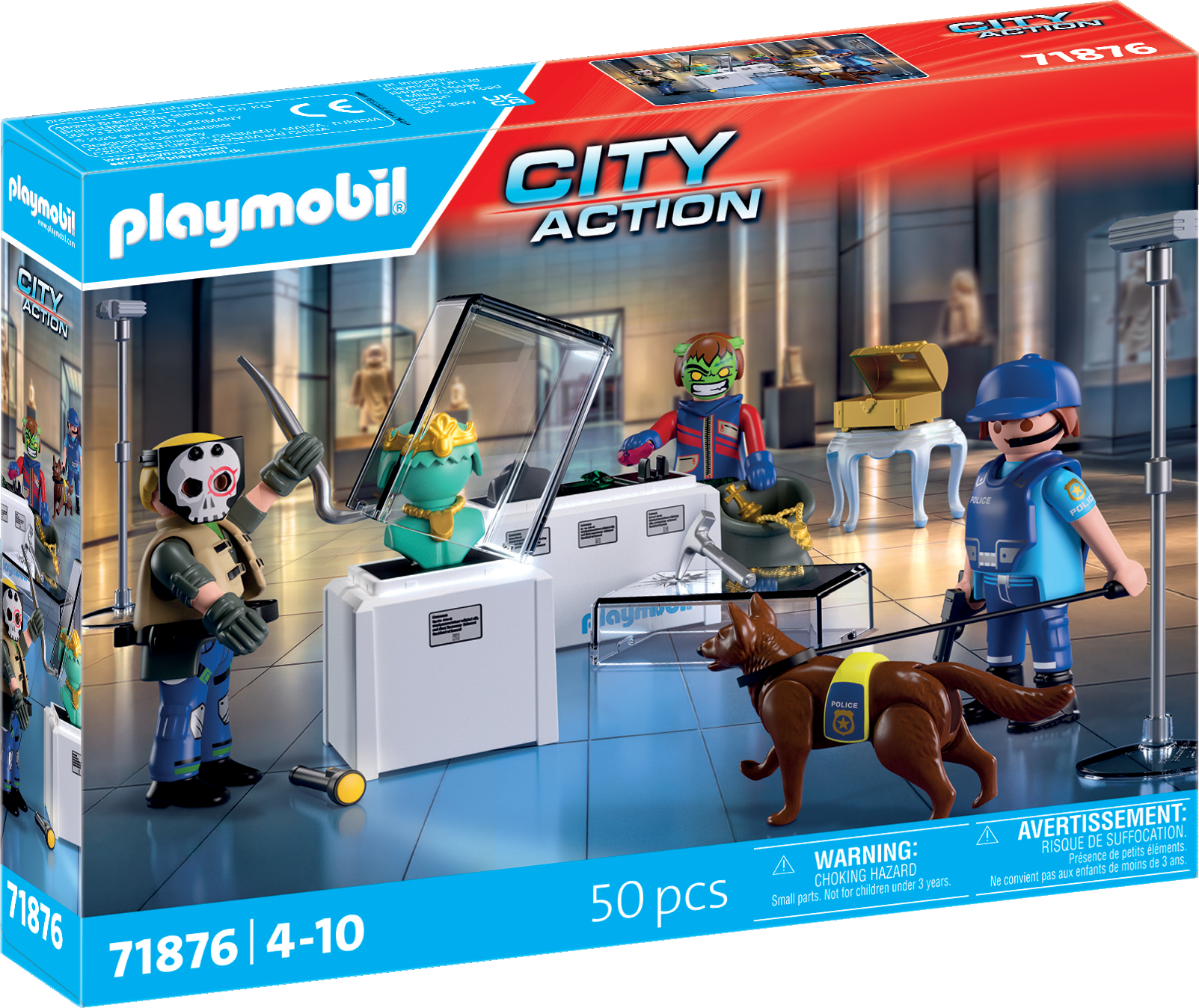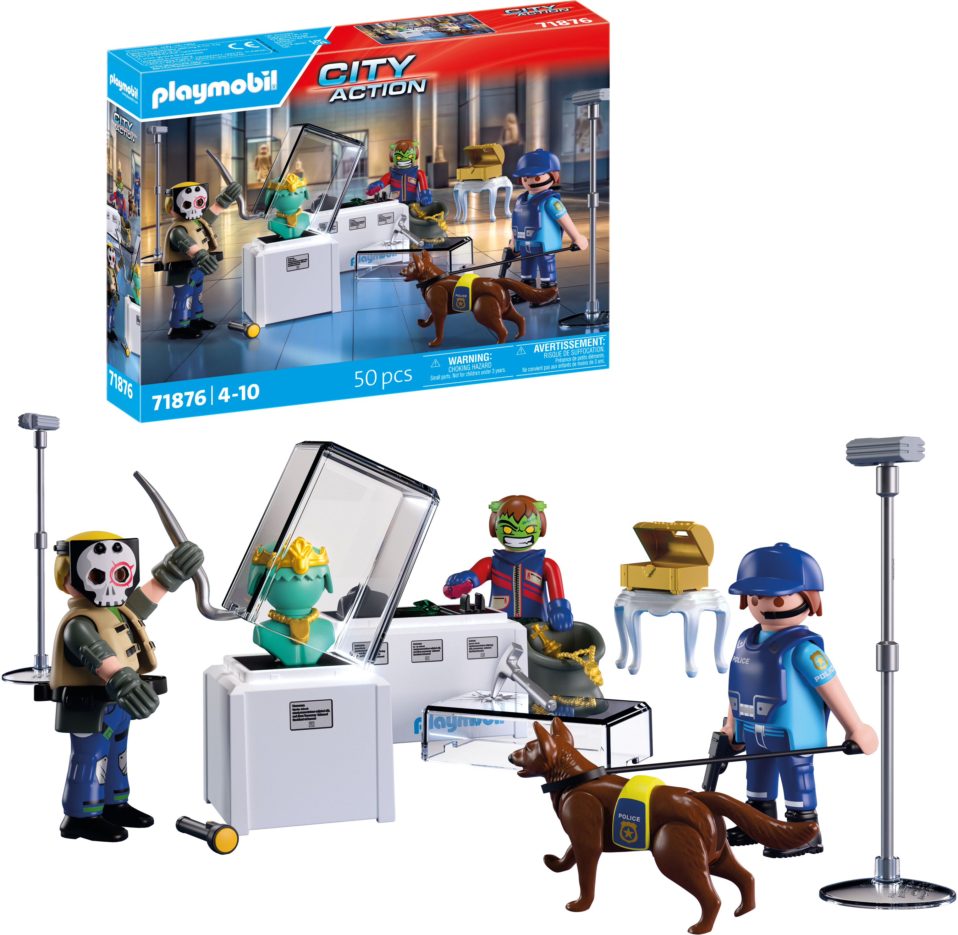 Figures: 1 policeman, 2 crooks (male and female); Animals: 1 guard dog; Accessories: 2 museum display cases with jewelry and crown, 2 spotlights, 1 side table, 1 chest with jewels, 2 removable crook masks, 1 rope with hook, 1 hatchet, 1 flashlight, 1 crowbar, 1 sack, 1 police cap with microphone, 1 pistol, 1 safety vest for the dog, 1 dog lead