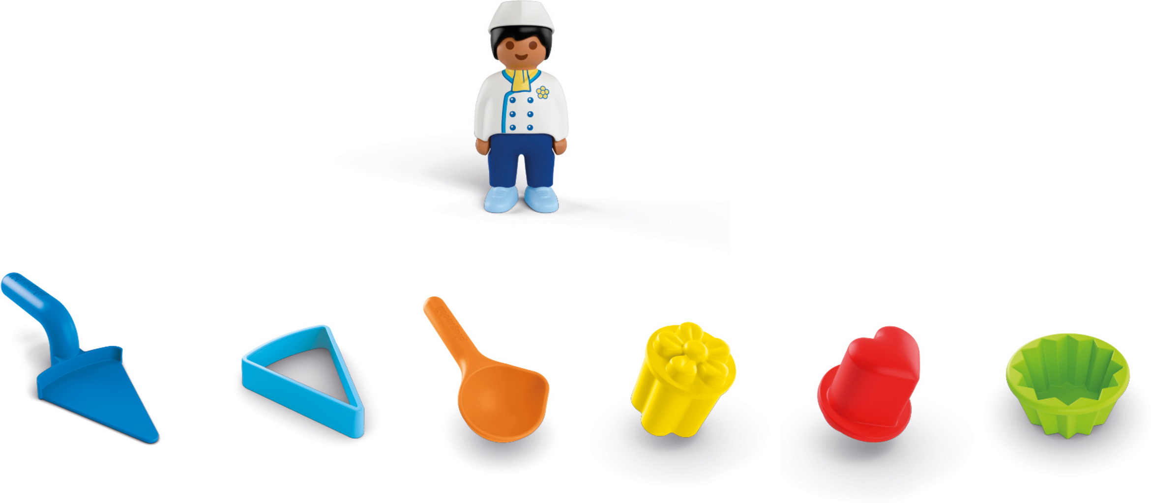 Figures: 1 baker, 1 scoop, 1 cake server, 1 cake triangle, 1 muffin mould, 2 stamps
