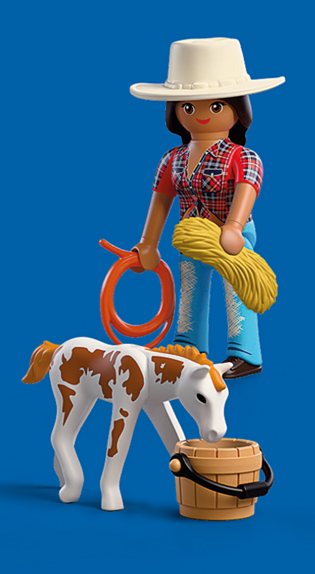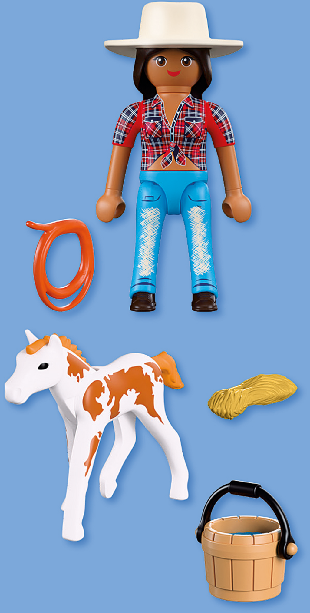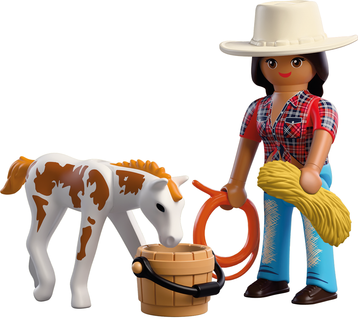 Figures: female horseback rider, 1 Appaloosa Foal, 1x cowboy hat, 1x water bucket, 1x lasso, 1x small bale of hay
