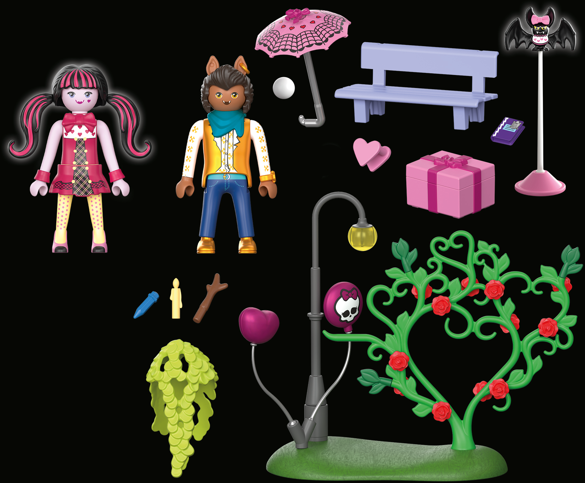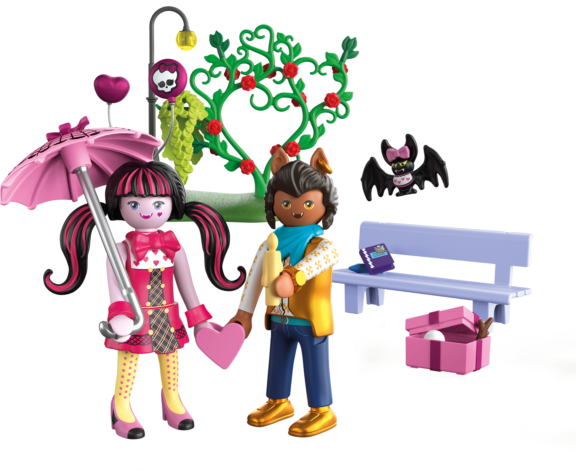 Figures: 1 female teen figure (Draculaura) 1 male teen figure (Clawd Wolf), 1 bat (Draculaura’s pet), park bench, umbrella, heart-shaped holder (connects to the figures), street light, heart-shaped balloons, heart-shaped plant decoration, gift box with small accessories