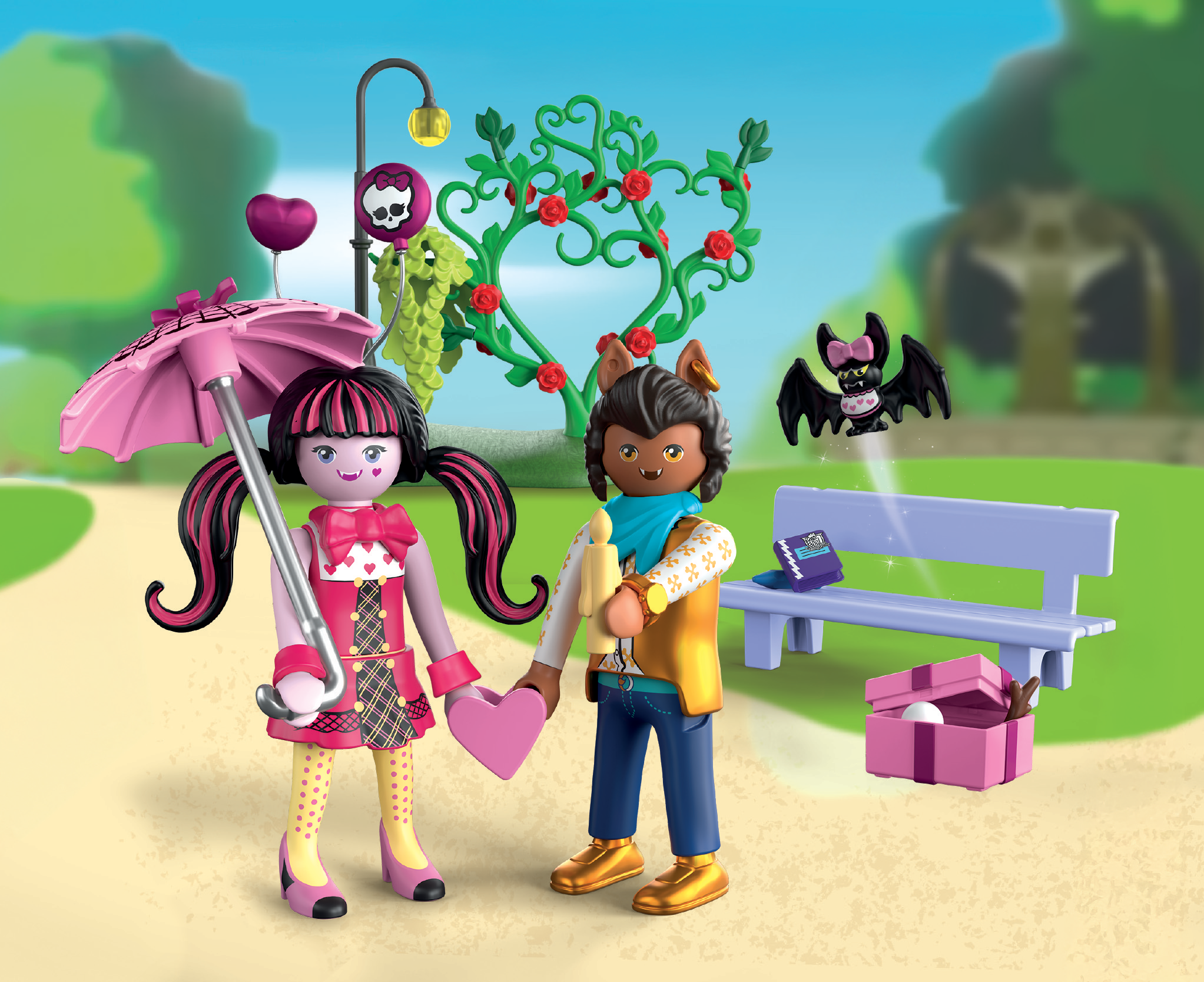 Draculaura and Clawd Wolf enjoy a sweet and spooky date in the park - under the lantern, on the magical bench, surrounded by heart-shaped vines, balloons and a glittering gift box. Count Fabulous, Draculaura's faithful bat, keeps a close eye on the couple.