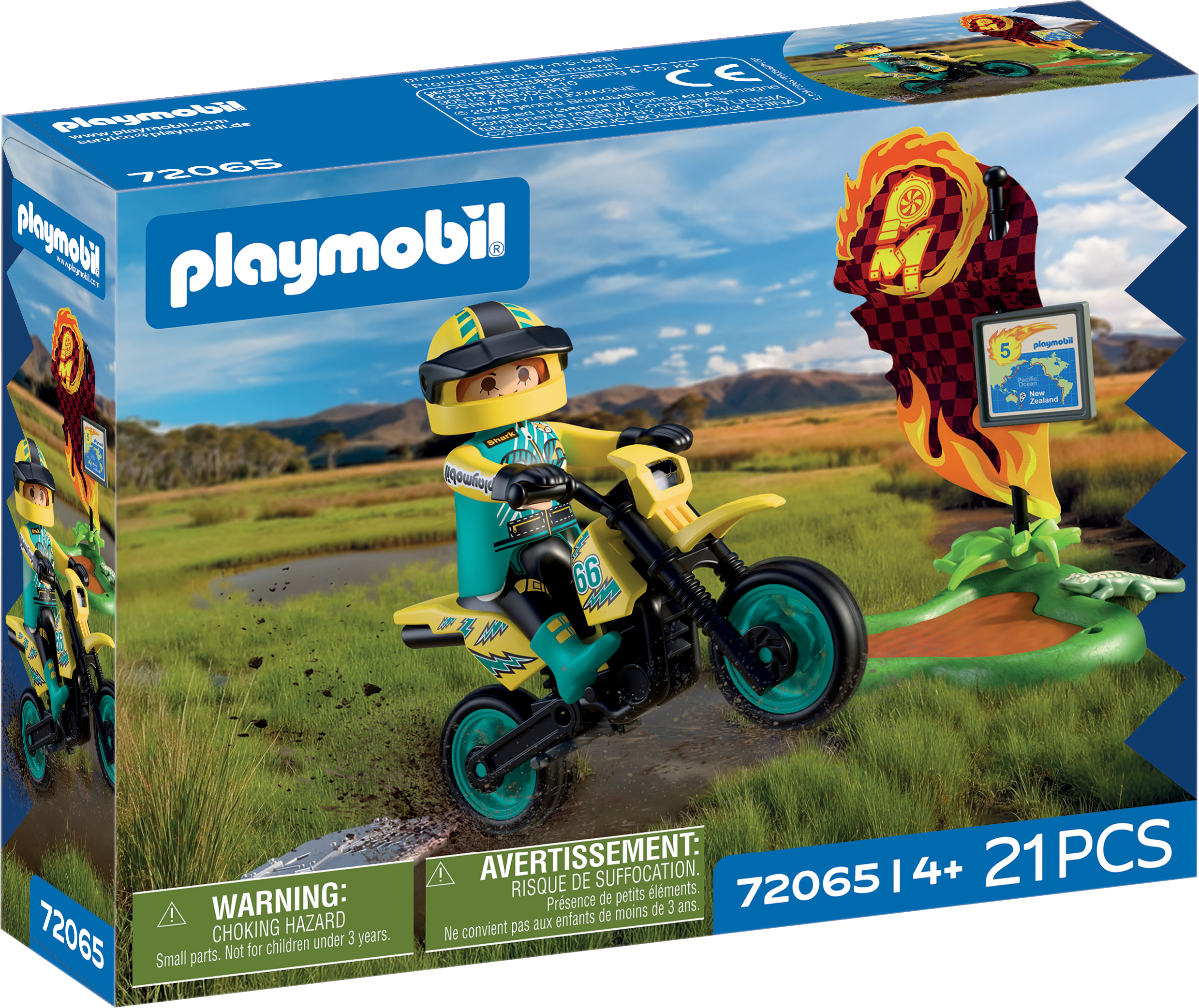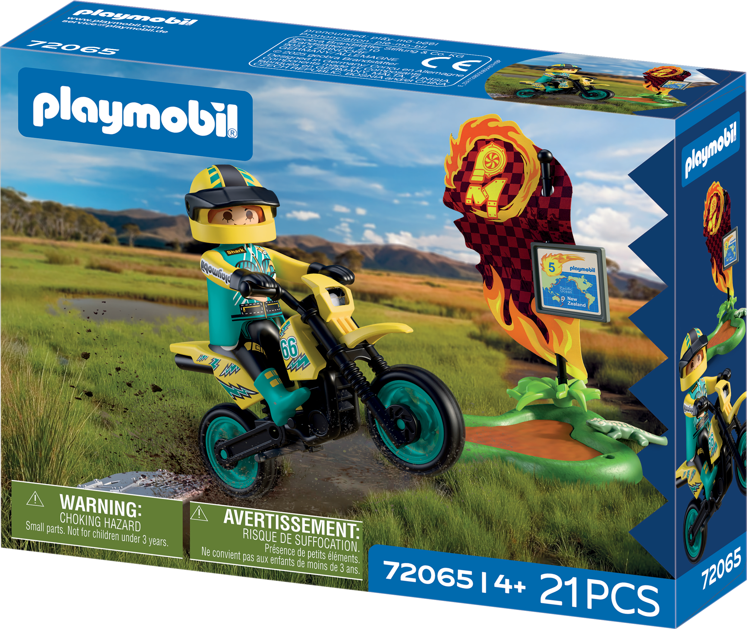 With the PLAYMOBIL off-road motorbike, children race through the New Zealand swamp. The racer masters mud puddles, uses the ramp for jumps and navigates through the stage with a map and information board. Plants, mud puddles and a curious iguana make for exciting, lively scenes.