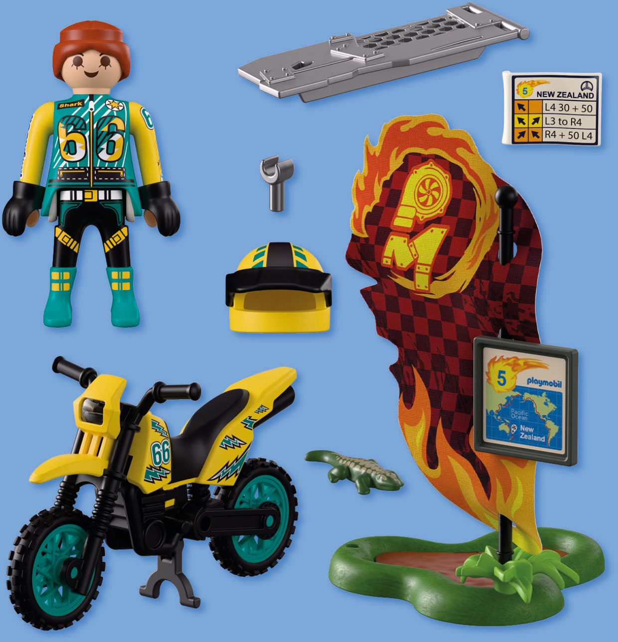 Accessories: 1 racer animal: 1 lizard accessories: 1 helmet, 2 arm guards, 1 off-road motorcycle, 1 flagpole, 1 map, 1 info board, 1 mud puddle, 1 ramp, 1 plant