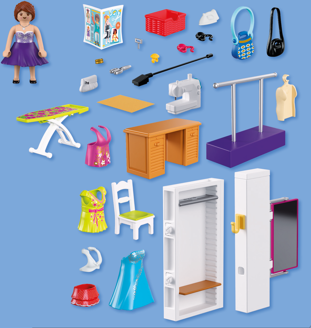 Figures: 1 woman, 1 bracelet, 2 skirts, 3 dresses, 1 top, 1 wardrobe, 1 movable mirror, 1 ironing board, 1 clutch, 2 handbags, 1 sewing machine, 1 desk, 1 chair, 1 piece of fabric, 1 pair of scissors, 1 pattern sheet, 1 ball of yarn, 1 pin cushion, 1 basket