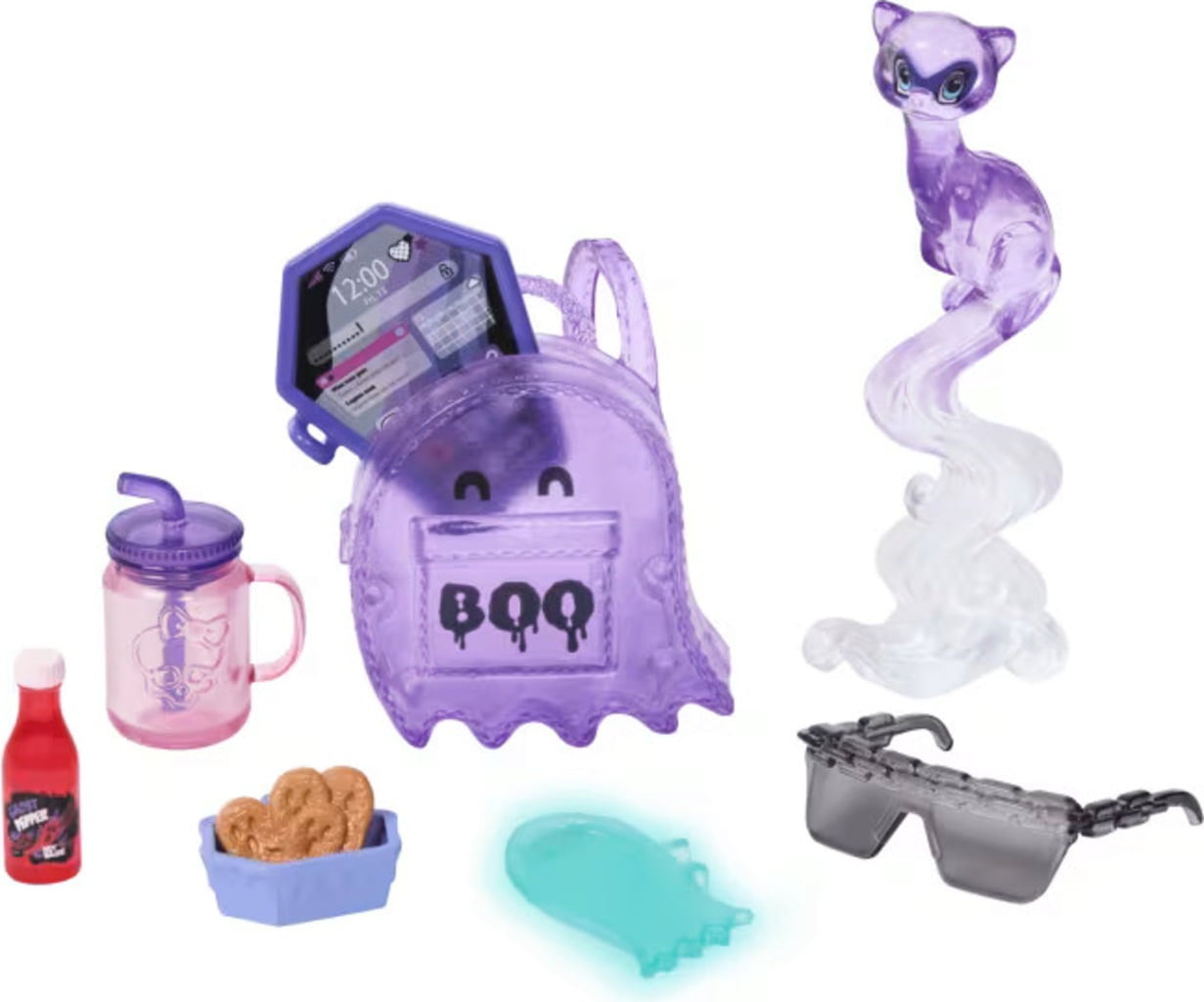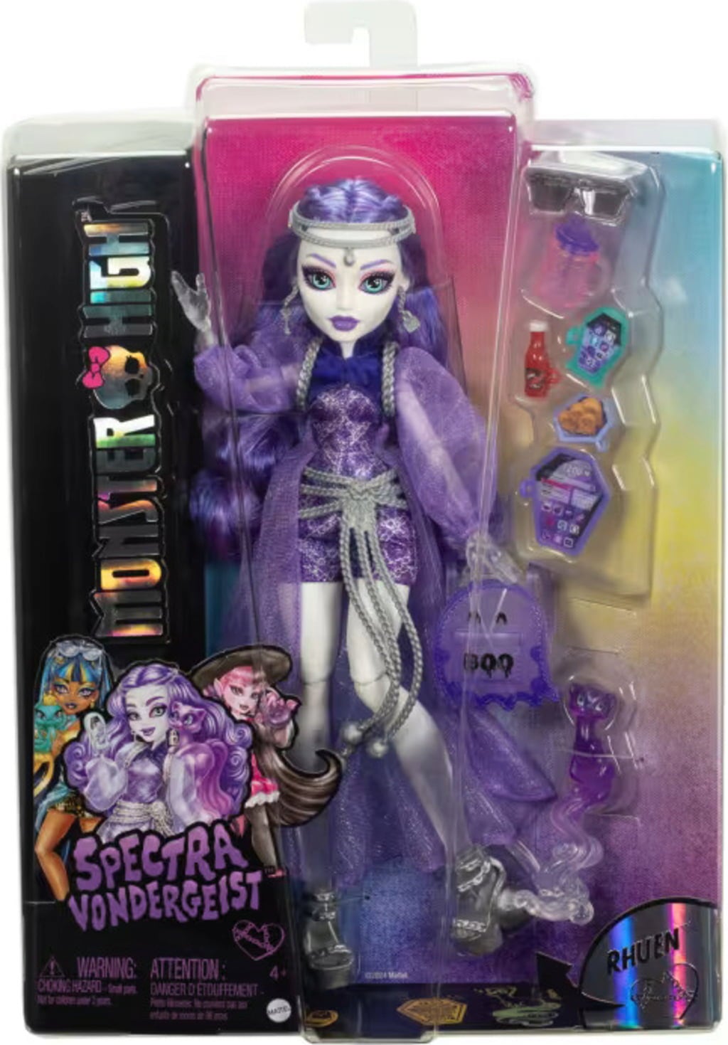 Spectra Vondergeist brings ghostly elegance to the Monster High world! With a purple-coloured outfit, translucent coat, stylish jumpsuit and lots of accessories, children can act out exciting stories and expand their collection. Rhuen the ferret accompanies them on all their adventures.