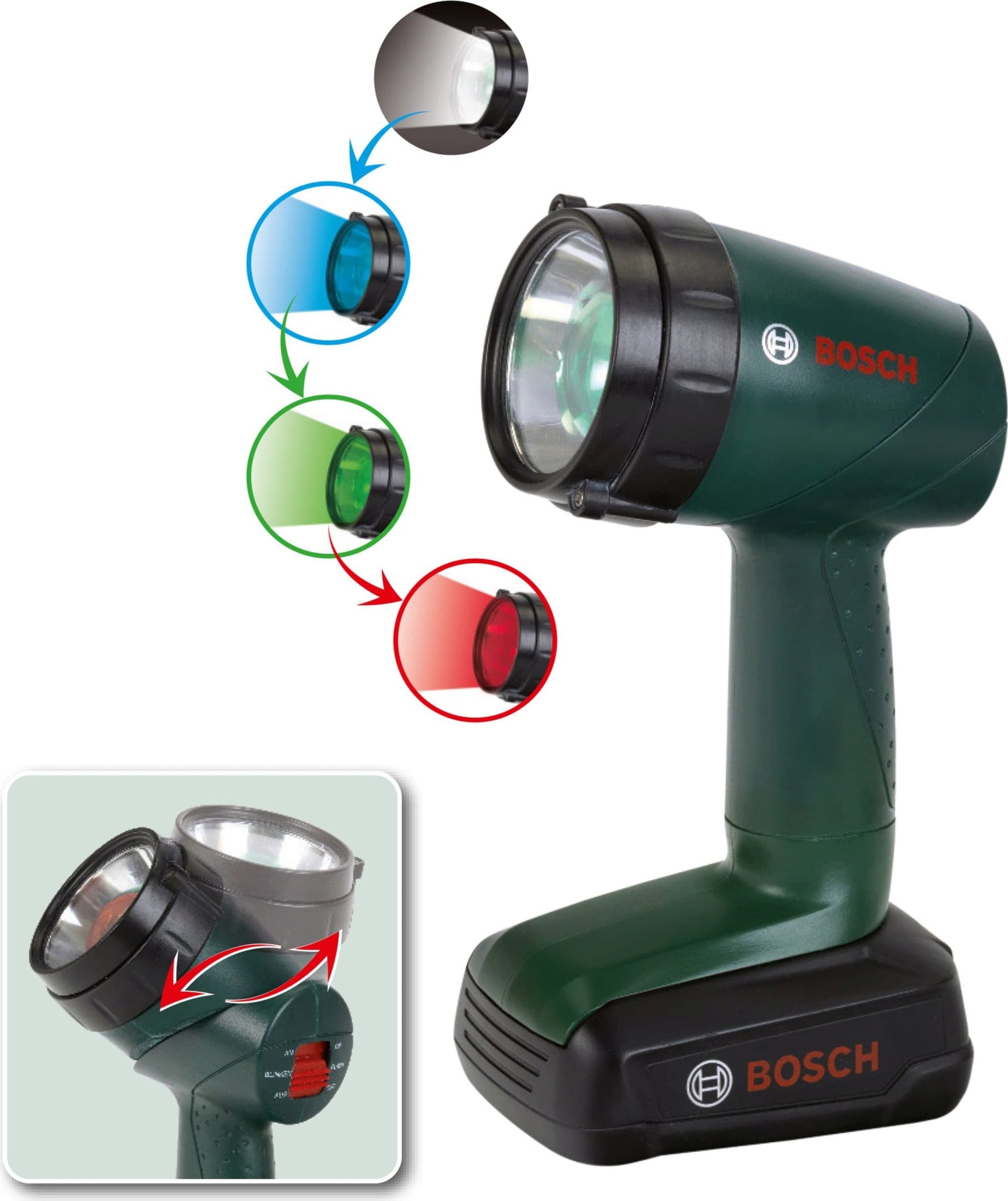 This robust lamp with an authentic Bosch look is the ideal companion for all little explorers who want to keep an eye on things in their workshop or on nighttime expeditions. Thanks to the flexible lamp head, the light beam can be precisely aligned so that no detail remains hidden. A special highlight is the rotating colour ring, which allows children to switch between white working light and coloured signals in red, green or blue. Whether as a stationary spotlight for the building site in the children's room or as a flashing warning light for secret missions, the handy light adapts perfectly to any play scenario. By adjusting and switching the functions, children can playfully improve their dexterity and immerse themselves in imaginative role-playing games.