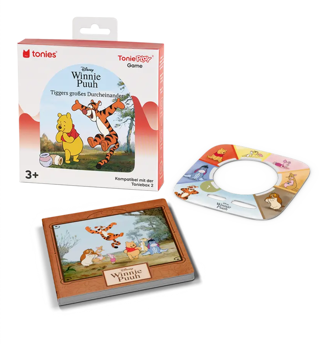 Oh dear, Tigger has been on the move again! His wild hopping has scattered his friends' treasures all over the Hundred Acre Wood and now everything is a mess. Now Winnie the Pooh and the others urgently need your help to find the lost items. This lovingly designed Tonieplay game takes children aged three and over on an interactive search for clues. With the accompanying, enchantingly illustrated picture book, you follow Tigger's tracks and discover page by page where the treasures are hidden. Each object you find unlocks new, heart-warming stories and fun surprises on the Toniebox 2.