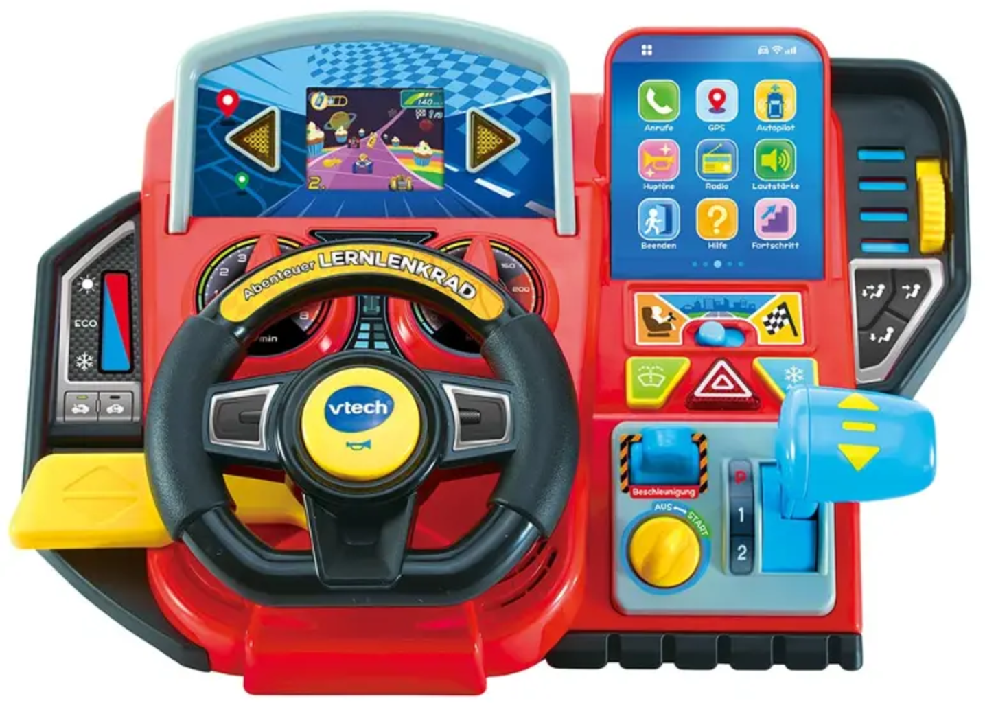 The Ready, Set, School adventure learning steering wheel combines role play with age-appropriate learning content. Various play modes and interactive controls playfully introduce children to basic traffic and learning concepts. The realistic design supports the imitation of everyday situations and ensures varied playtime fun.